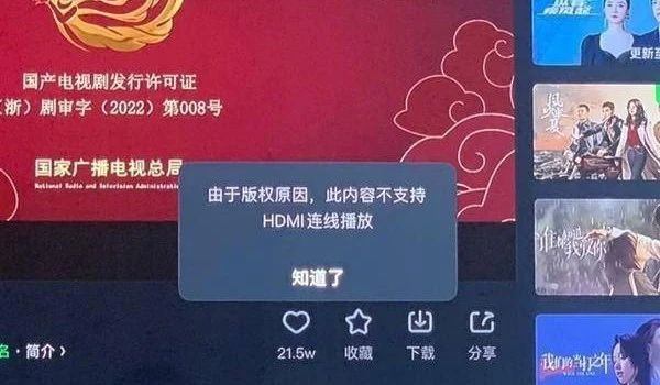 其实现在很多智能电视都带有软件投屏功能。可是很多时候,视频app是禁止你投屏的。你有遇到过类似这样的提示嘛?无线投屏直接黑掉,没有画面;有线HDMI连接电视,直接提示「版权原因,无法播放」。