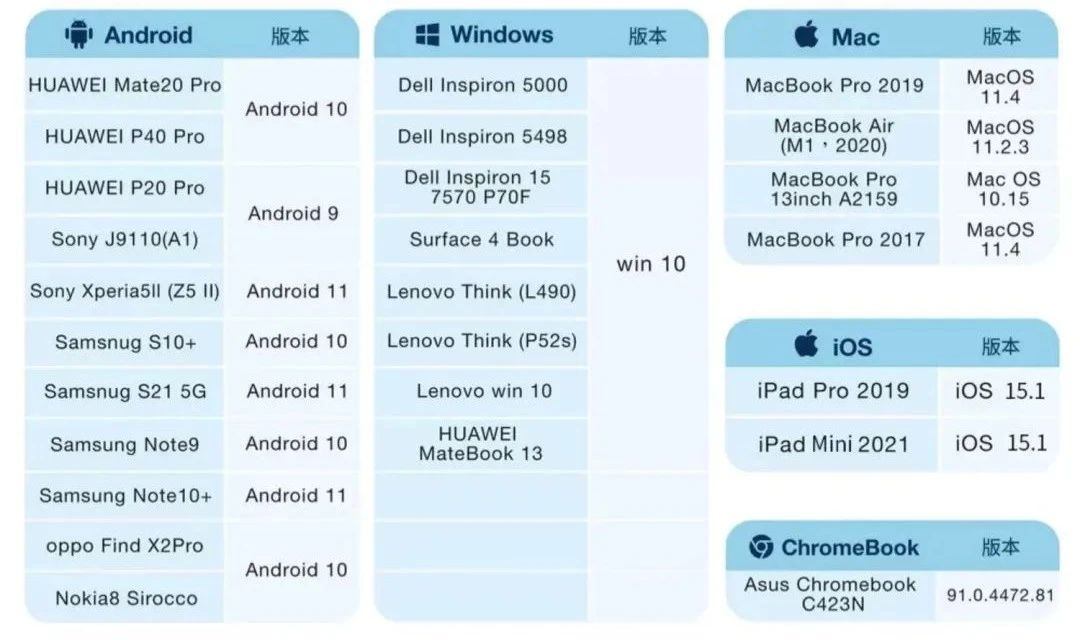 下面给大家一个不完全的支持设备表格。因为支持的设备太多,如果你不清楚自己的手机或平板/ipad支不支持,可以网上搜索自己的设备确认哈。